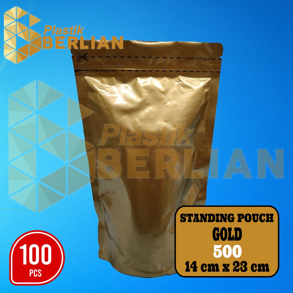Barang Standing Pouch Alumunium Foil Klip / Clip 500 G Full Gold Emas 14x23 Promo Isi 100 biasa. Pengiriman biasa. layanan toko juga biasa. karena awak orangnya biasa aja .