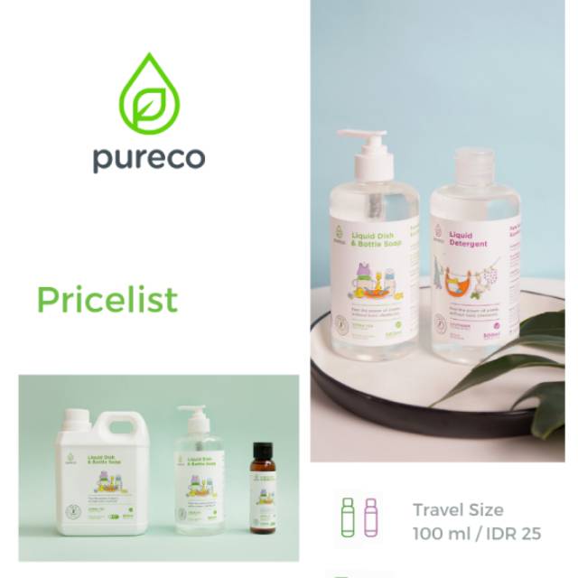 Trazel size : 100ml / 45rbHome size : 500ml /49.5Refill size : 900ml /65rb Sabun cuci botol / peralatan makan anak atau bayiKeunggulan Pureco:1.Pureco use Plant Based Active Ingredient Bahan dasar yang digunakan diekstrak dari tumbuhan sugarcane dan coconut2.Pureco is formulated Without Toxic ChemicalPureco tidak menggunakan bahan kimia yang dapat membahayakan manusia dan lingkungan (Pureco diformulasikan tanpa SLS, Paraben, Formalin, Pewarna, Chlorin, Phospate, Nonyl Phenol, Petroleum). 3.Pureco is certifiedPureco telah di test dan mempunyai sertifikat. Paraben dan Formalin tidak ditemukan dalam produk Pureco. Juga kadar Phosporus hampir 0%. Pureco juga telah terdaftar dalam Kementrian Kesehatan Indonesia. Sertifikat dapat diakses di website Pureco4.Resiude of Pureco is biodegradeableKarena terbuat dari ekstrak tanaman, maka residue dari sisa pencucian Pureco dapat diuraikan oleh alam, sehingga ramah lingkungan5.Pureco is concentratedPureco adalah sabun cuci konsentrat, maka penggunaannya lebih hemat dibandingkan sabun cuc non konsentrati lainnya.6.Pureco use no animal ingredientPureco adalah sabun halal, tidak menggunakan bahan dasar yang didapat dari binatang. Maka Pureco adalah pilihan yang aman bagi siapa