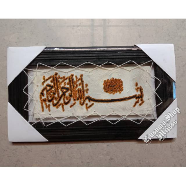 Kaligrafi lafal BasmallahBahan : Kulit kambingUkuran : 37x21cmKaligrafi ini di lukis dengan teknik sungging oleh pelukis ahli dan menggunakan warna yg menarik sehingga memberikan warna eksotik.Bahan kulit kambing yg di lapisi dengan plastik transparanBenang putih yg di gunakan untuk mengaitkan kulit pada bingkai.Bingkai kayu di cat hitam#kerajinanKulitKambing#kaligrafi