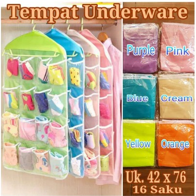 READY :PinkhijaubiruWanita suka koleksi aneka model dan warna celana dalam. Namun seringkali koleksi celana dalamnya numpuk atau berserakan di lemari, malu kan jika dilihat tamu.Dengan Korean underwear pouch, celana dalam jadi tersimpan rapi dan mudah diambil saat hendak dipakai.Pouch terdiri dari 16 sekat transparan, tiap sekat dapat di isi 3-4 pcs celana dalam.Pouch dapat digantung ke hanger, memudahkan untuk digantung di dalam lemari. Bagian atas terdapat lobang untuk hanger.Selain untuk tempat panties, pouch juga dapat digunakan untuk tempat menyimpan aksesoris. Dengan sekat yang cukup banyak, bisa diisi dengan aneka aksesoris seperti kalung, gelang, anting dan pernak pernik lainnya.Material : Polyesternanti air. Sekat bahan plastik transparanSize : 42 x