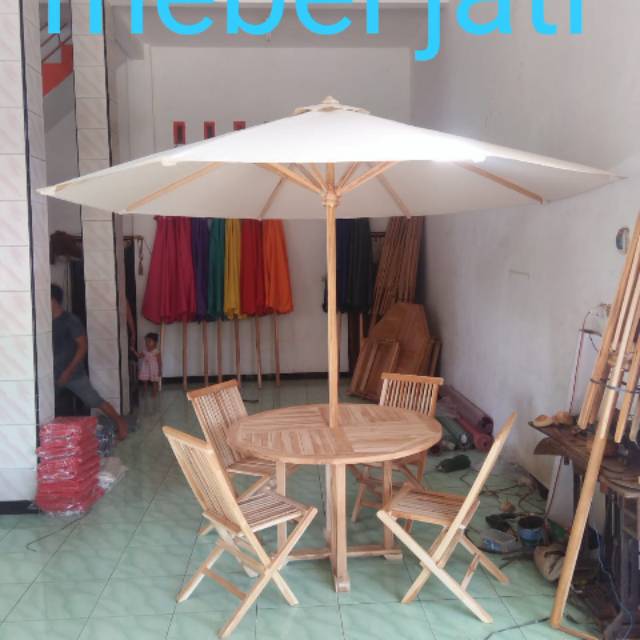 Bahan kayu jati solid kualitas mantap. Diameter payung 3MSet meja payung terdiri dari:Meja bundar dia. 120cmPayung bundar dia. 3m plus kain payung parasut tebal/anti air.4 pcs kursi lipatset meja payung terdiri dari:meja bundar ukuran 1 meterpayung bundar 2,5 meter pake kain parasit4 pcs kursi lipatharga satu set nya 1250,000set meja payung terdiri dari:meja bundar ukuran 120 mpayung ukuran 3 m. bundar pake kain kantata4 pcs kursi lipatharga satu set nya 1,6 jutaklo pake sablon rumbai harga tambahharga tergantung ukuran merk kain dan mentah belum finisingharga berbeda bedaKain payung menggunakan bahan standar parasit tebal/waterproof, atau menggunakan bahan Drill (kantata Grand Canyon, Nagata), Kanvas (SR. santekTersedia pilihan warna kain payung.Finishing menggunakan melamine / politur khusus outdoor, lebih tahan terhadap cuaca panas, hujan, dan hama kayu sehingga mebel lebih