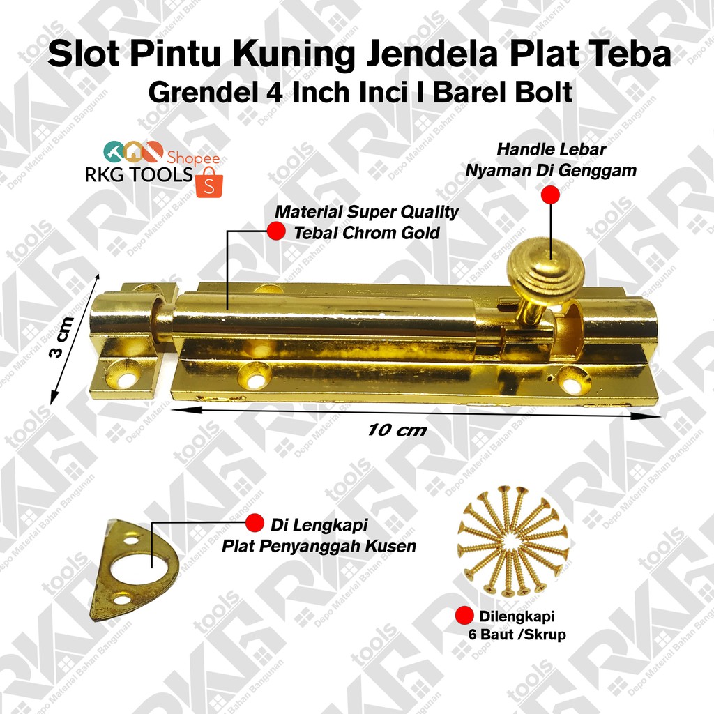 Merk : HPPGrendel pintu / jendela.Ukuran 4 inci.Kokoh dgn bahan tebal plat chrom kuning emas, sehingga tdk mudah berkarat. Include s