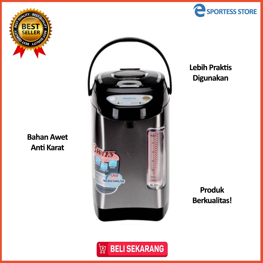 Termos Air Denpoo Termos Denpoo Thermo Pot DEP-858 - 4.8 L SELAMAT DATANG DI TOKO KAMIBARANG BERKUALITAS DENGAN HARGA BERSAHABAT~ REAL PICT~ SEMUA PRODUK READY STOCK~ PENGIRIMAN SENIN - SABTU~ ORDER SEBELUM JAM 16.00 DIKIRIM HARI YANG SAMAWELCOME RESELLER DAN DROPSHIPERYANG BERMINAT BISA PERSONAL CHAT YA ^^MINGGU DAN HARI RAYA LIBUR PENGIRIMANSELAMAT BERBELANJA ^^Listrik 500 Watt kapasitas 4.8 L bahan Stainless SteelDenpoo Thermo Pot DEP-858 - 4.8 L adalah Thermo Pot yang dapat Anda gunakan dengan praktis untuk membuat berbagai macam minuman atau makanan yang membutuhkan air panas seperti kopi, teh, ataupun mie instan. Dengan ketel elektrik ini, Anda dapat dengan cepat menyeduh kopi atau teh tanpa harus memasak air dan menunggunya masak.Tabung Stainless SteelDenpoo DEP-858 dengan material Stainless Steel akan lebih cepat dalam memanaskan air dan membuat Thermo Pot ini tahan lebih lama, sehingga Anda dapat memakainya untuk jangka waktu yang lama.Putaran 360 DerajatThermo Pot dengan kepala yang dapat diputar 360 derajat sehingga Anda dapat menyeseuaikan kucuran air yang diinginkan.Kapasitas 4.8 LDenpoo Thermo Pot DEP-858 - 4.8 L. Dengan kapasitasnya yang besar ini, Anda dapat sekaligus membuat air panas untuk membuat kopi, teh atau mie instan.3 Cara Pengeluaran AirDengan fitur 3 cara pengeluaran Air membuat Anda leluasa dalam membuat apapun seperti kopi teh atau sekedar air panas.Apabila ingin aman dapat tambahkan packing dengan bubble wrap, klik link ini untuk menggunakan bubble wrap / Plastik Hitam (kerusakan barang selama pengiriman bukan tanggung jawab kami jika anda tdk menambahkan packing apapun ^^