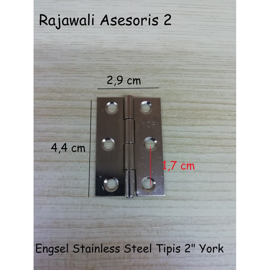 Engsel Stainless Steel Tipis 2" YorkMerk : YorkUkuran: 2"Ketebalan : 1 mmHarga per pasangBahan Stainless Steel1 dus terdiri dari 12 pasangKegunaan : Untuk engsel keperluan meubel, furniture, box, dllProduk tidak dilengkapi sek
