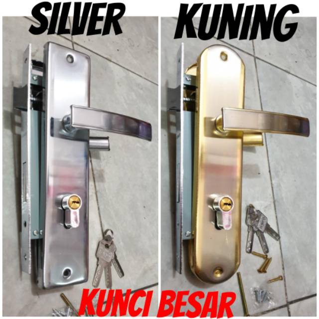 kunci pintu besar komplit body lidah slinder komputer isi 3 anak kunci PROMO- pegangan/handle berbahan besi plat- body lidah panjang kedalam 17cm, panjang plat luar 24cm, lebar kedalam 6,5cm- slinder isi 3 anak kunci- as dan baut2 pemasagan.tersedia 2 warna(silver dan kuning) untuk pemesanan harap tuliskan di cat